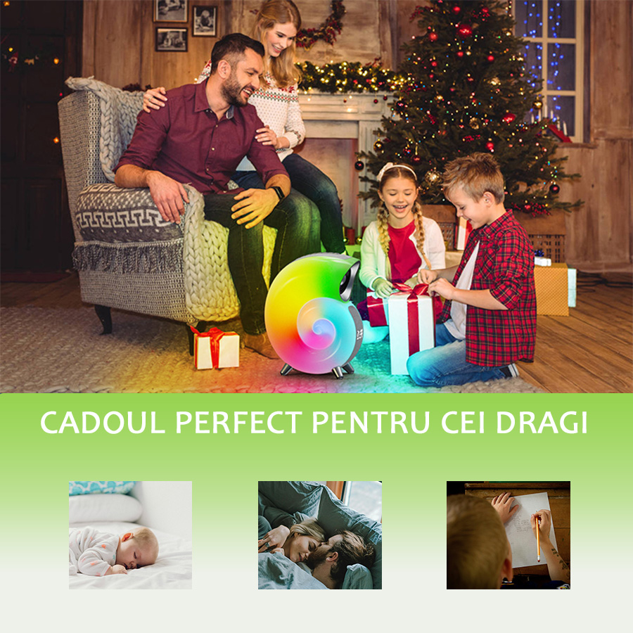 Lampa de veghe muzicala pentru copii si adulti: Designul sau unic in forma de melc si functiile multiple fac aceasta lampa ideala pentru toate varstele. Include sunete albe special concepute pentru a crea un mediu calm si linistitor, perfect pentru somnul copiilor.