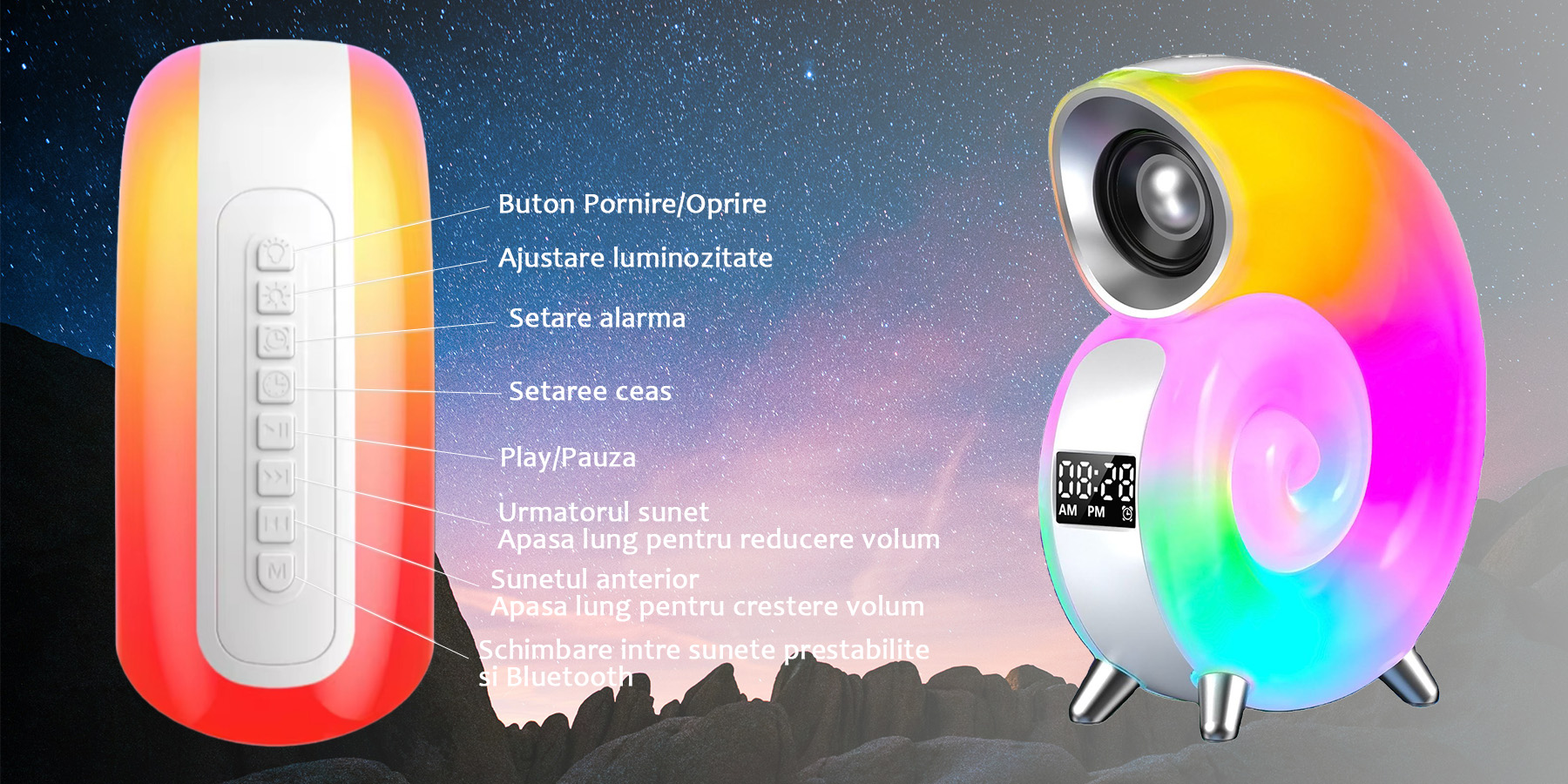 Tags: boxa bluetooth, difuzor stereo, lampa de veghe, lampa de veghe copii, lampa de veghe cu boxa, lampa relaxare, lampe cu boxa