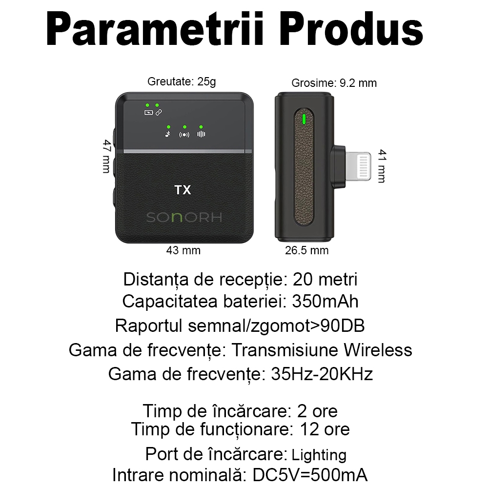 Microfon Lavalieră Wireless SONORH® SX8, Lightning, Ajustare Volum, Reducere Zgomot, Afișaj LED, Plug & Play, Compatibil iPhone/iPad și Cameră Foto/Video, Vlog/Live/Interviuri