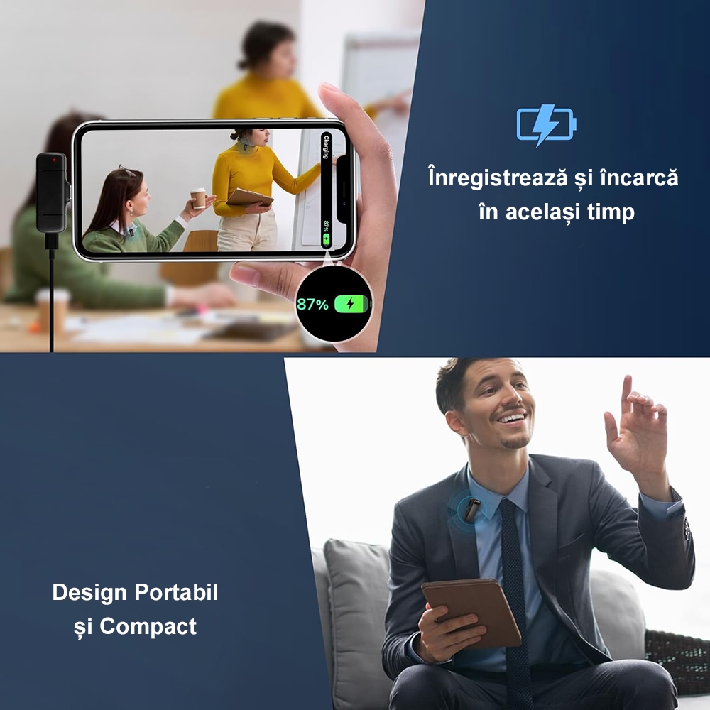Microfon Wireless Lavalieră SONORH®, USB Type-C, Noise Cancellation, Plug & Play, Carcasă de Încărcare, Autonomie 30 ore, Pentru Podcast, Vlog, Interviuri, TikTok, YouTube