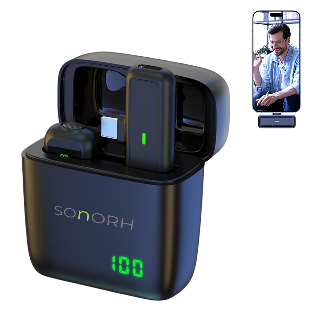 Microfon Wireless Lavalieră SONORH®, USB Type-C, Noise Cancellation, Plug & Play, Carcasă de Încărcare, Autonomie 30 ore, Pentru Podcast, Vlog, Interviuri, TikTok, YouTube