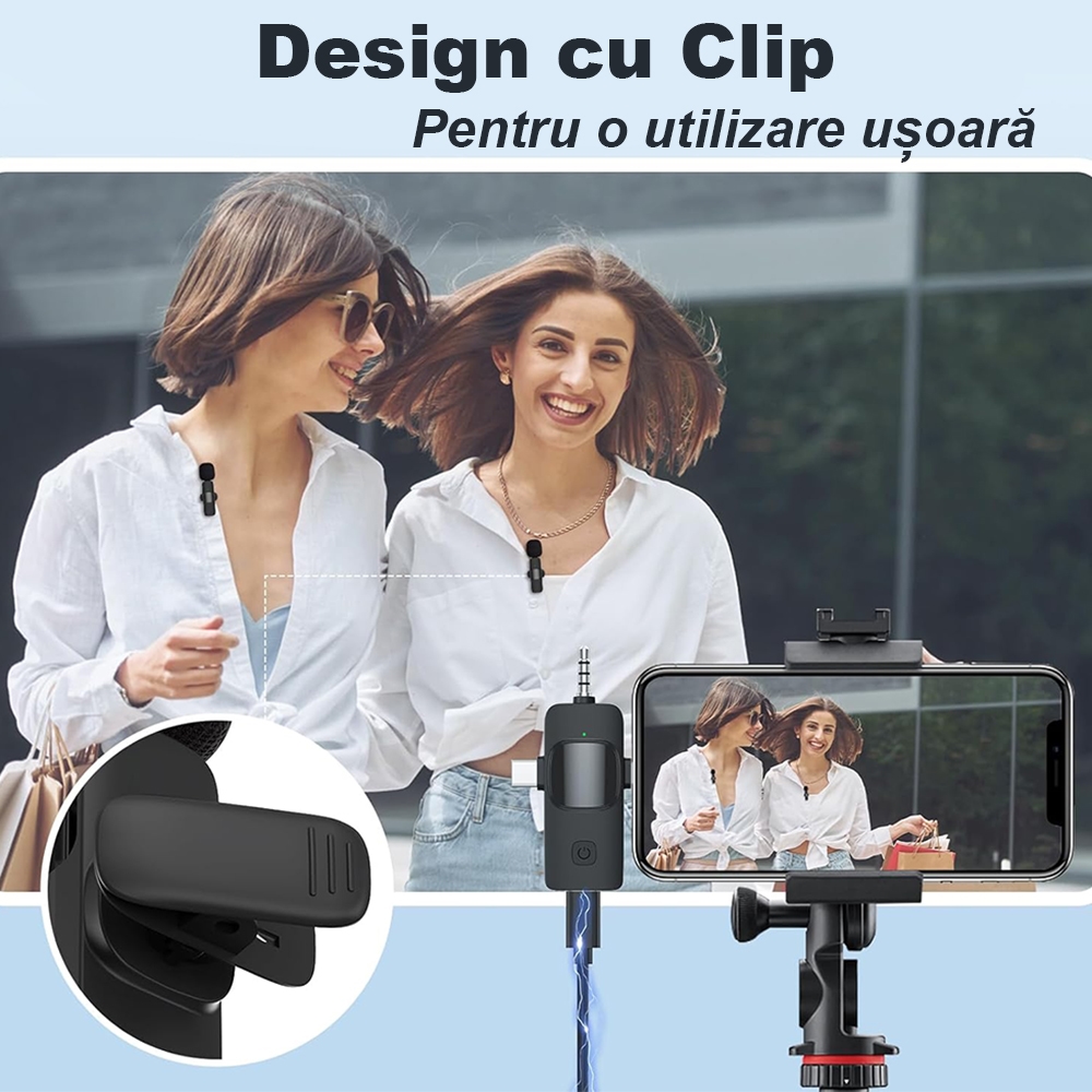 Set 2 Microfoane Lavalieră Wireless SONORH® Pro, USB-C + Lightning + Jack 3.5mm, Compatibil Android/iPhone/Laptop/Camera, Reducere Zgomot, Plug & Play, Interviuri/Vlog/Live/Video