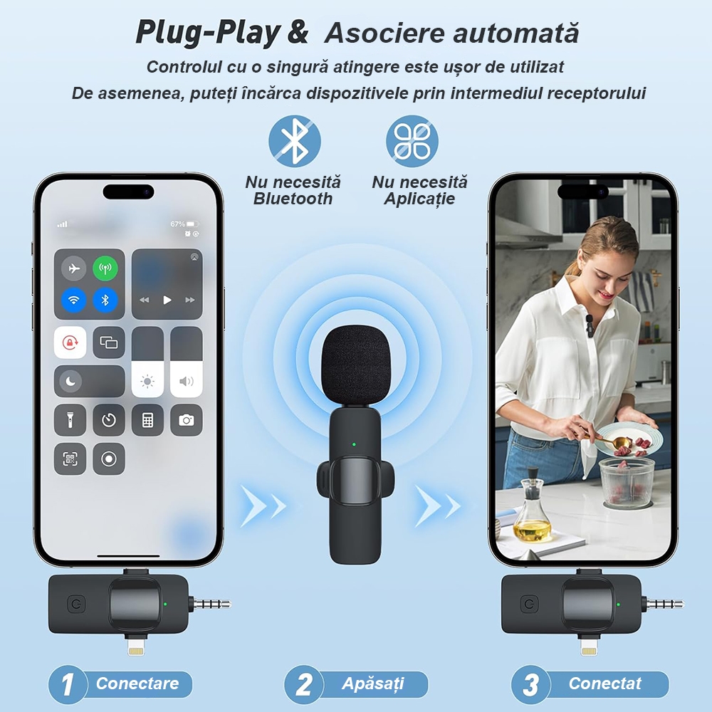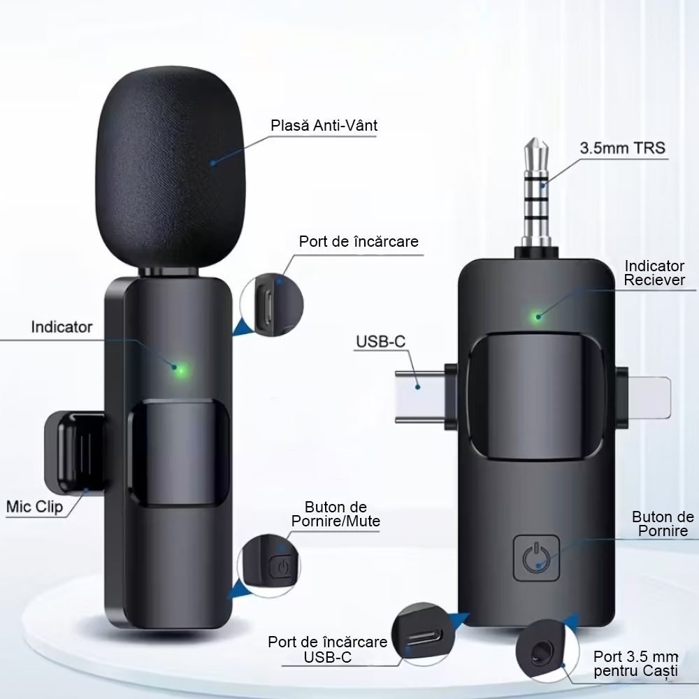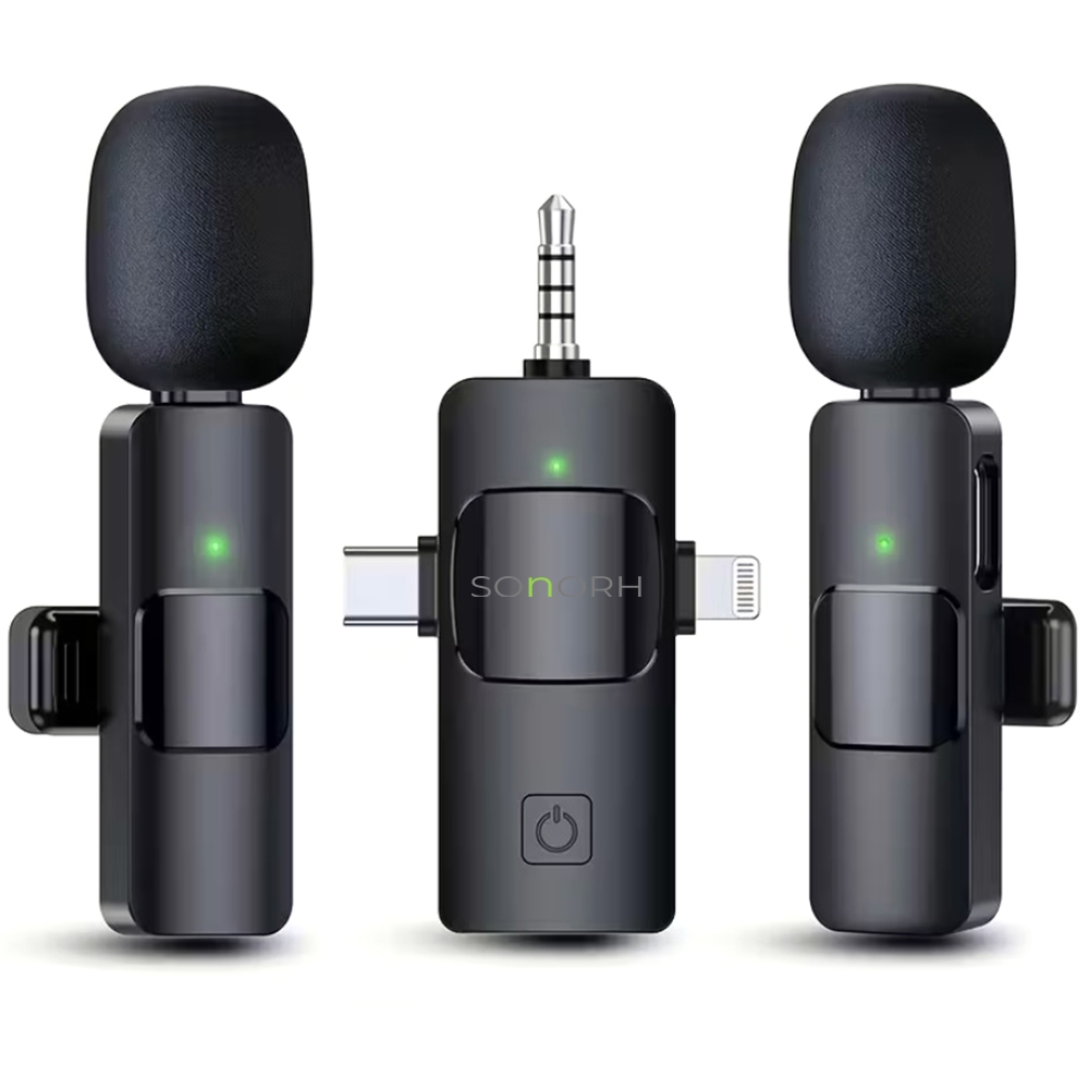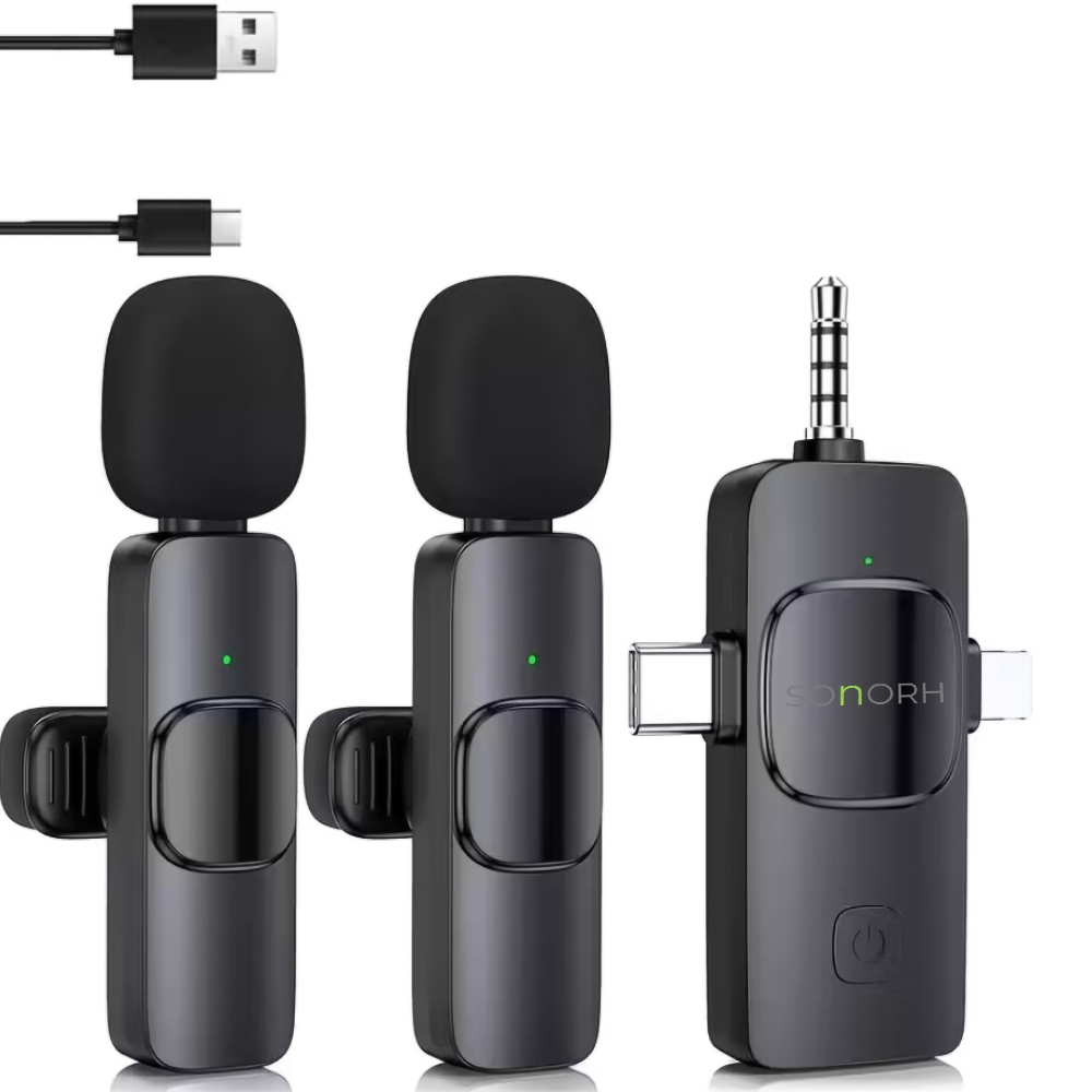 Setul de 2 microfoane lavalieră wireless SONORH® este soluția ideală pentru înregistrări audio clare și profesionale, fie că este vorba despre interviuri, vloguri, podcasturi, prezentări, cursuri online sau filmări în exterior. Compatibil cu aproape orice dispozitiv, acest set oferă 3 modalități de conectareUSB Type-C, Lightning (iPhone) și Jack 3.5mm – ceea ce îl face extrem de versatil și ușor de utilizat.