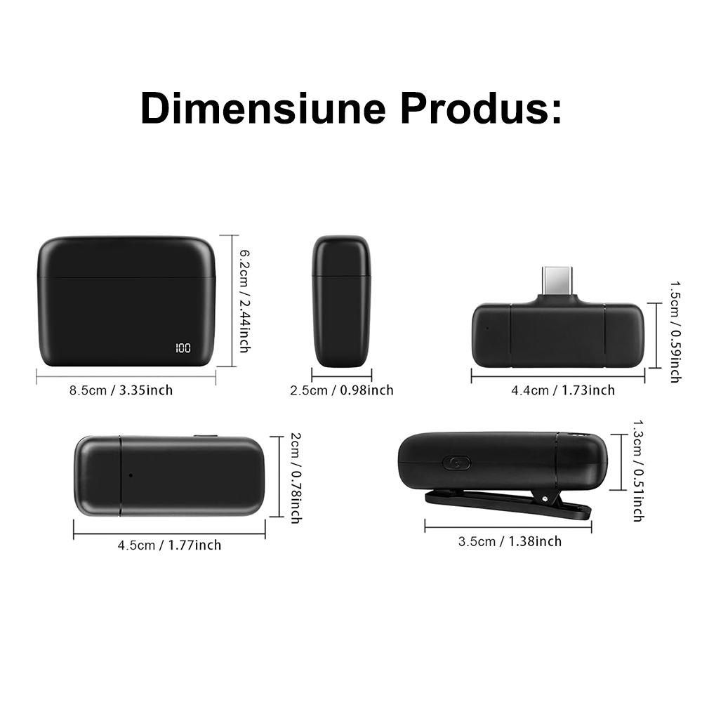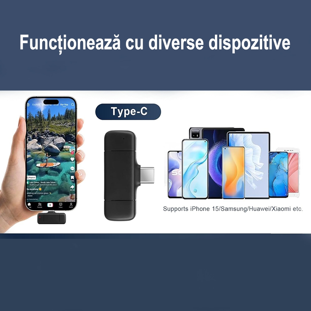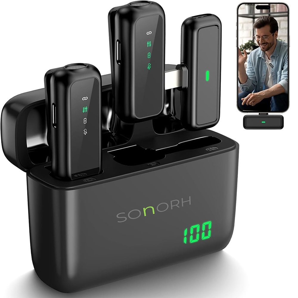 Setul de 2 microfoane wireless lavaliera SONORH® este solutia ideala pentru filmari profesionale si inregistrari clare, atat in interior, cat si in exterior. Conceput pentru creatori de continut, jurnalisti, profesori si influenceri, acest sistem de microfoane este compatibil cu telefoane si tablete cu port USB Type-C.