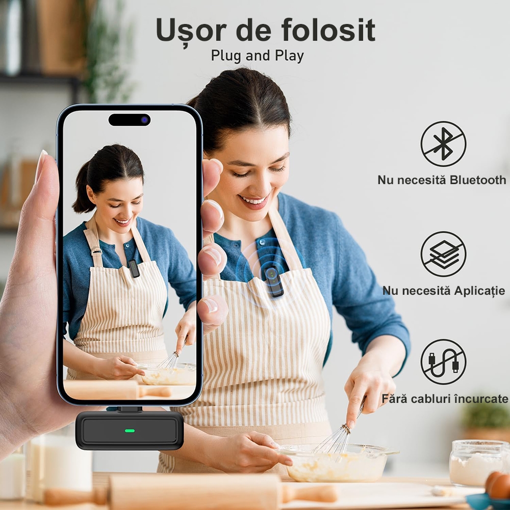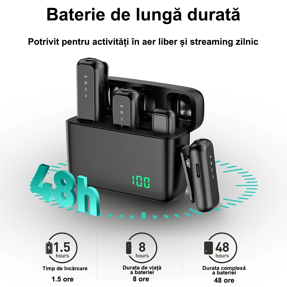 Microfoanele sunt echipate cu functie Smart Noise Cancellation pentru reducerea zgomotului de fundal si transmiterea clara a vocii. Se conecteaza instant prin functia Plug & Play, fara aplicatii suplimentare. Carcasa de incarcare magnetica asigura autonomie extinsa de pana la 50 ore, fiind perfecta pentru vloguri, podcasturi, interviuri sau transmisii live.