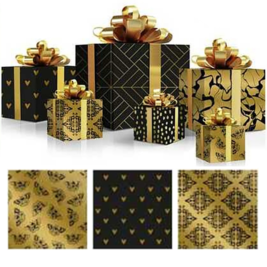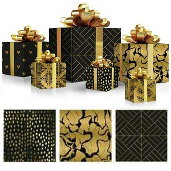 Ofera cadourilor tale un aspect premium cu acest set de 3 role de hartie pentru impachetat, realizate in nuante rafinate de auriu si negru, perfecte pentru orice ocazie importanta. Modelele sunt atent realizate, cu un design elegant si modern, care transforma orice cadou intr-o prezentare memorabila.