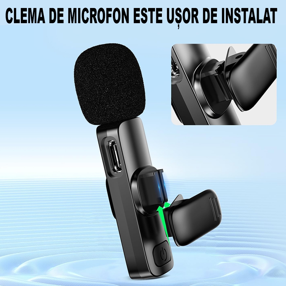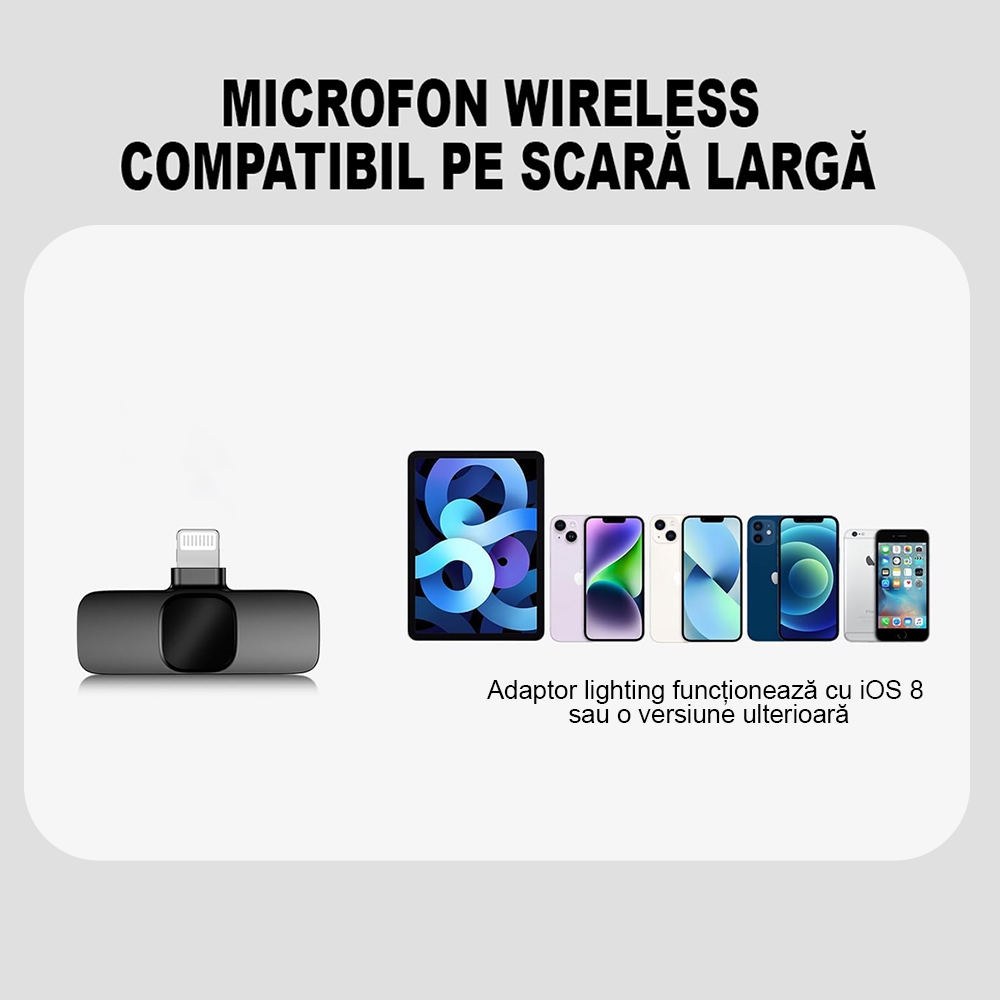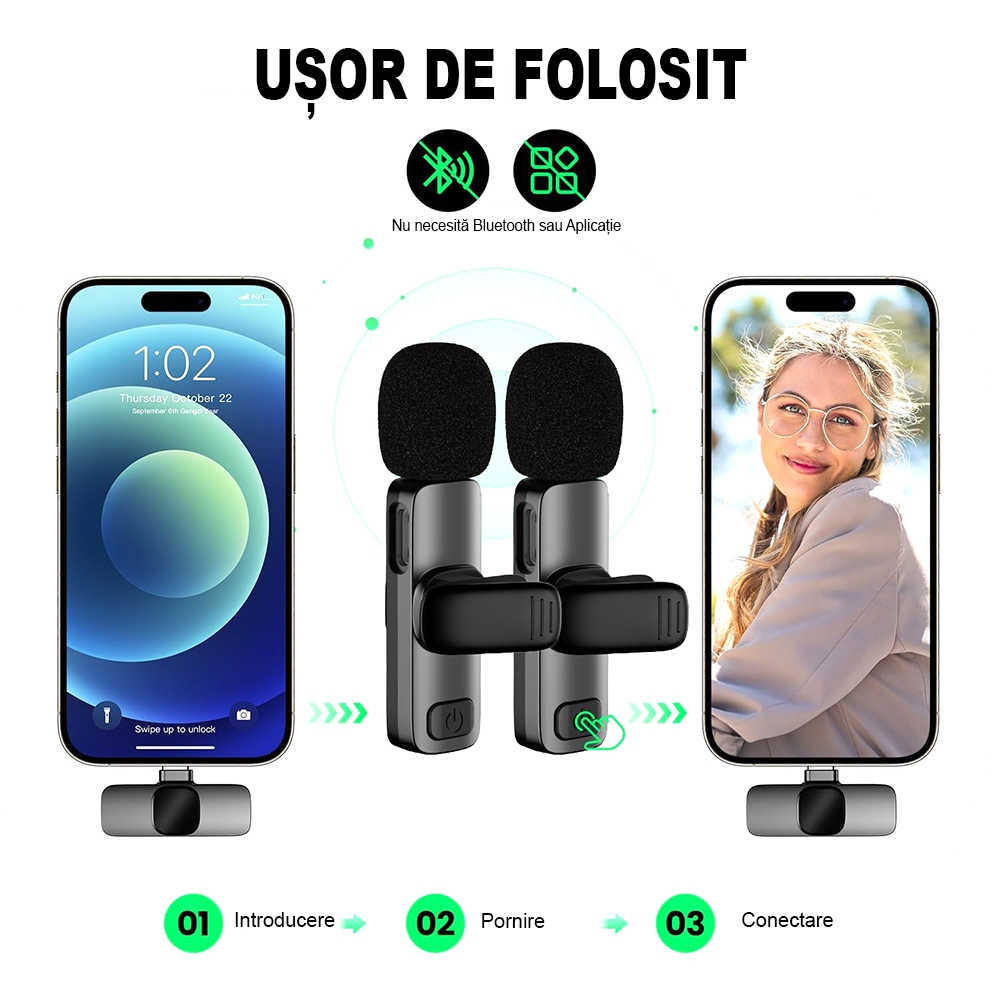 Fără aplicații, fără configurări complicate. Doar conectezi adaptorul Lightning sau Type-C la telefon, pornești microfoanele și începi să înregistrezi. Ideal pentru utilizare rapidă, chiar și de către începători.