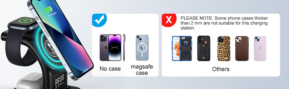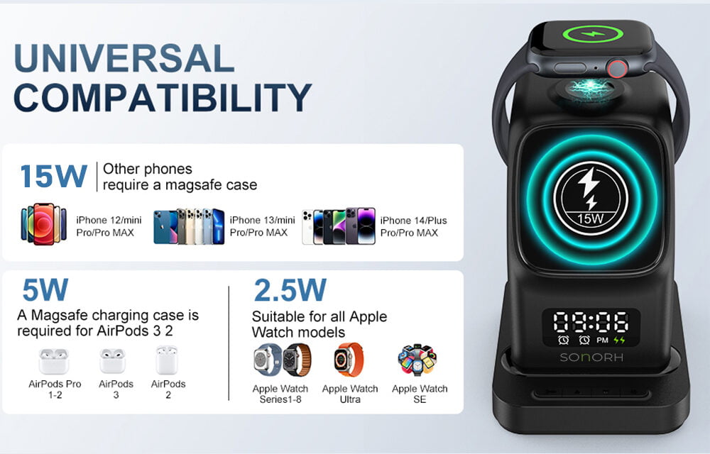 ✅ Compatibilitate Largă: Stația de încărcare wireless SONORH® 5-în-1 suportă iPhone 12 și modelele ulterioare, asigurându-vă cea mai bună experiență de încărcare. Încărcătorul este, de asemenea, echipat cu protecție la încărcare, garantând că dispozitivul dumneavoastră rămâne în condiții de siguranță în timpul încărcării.