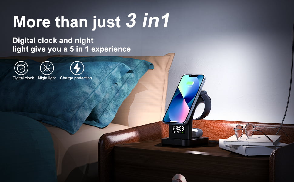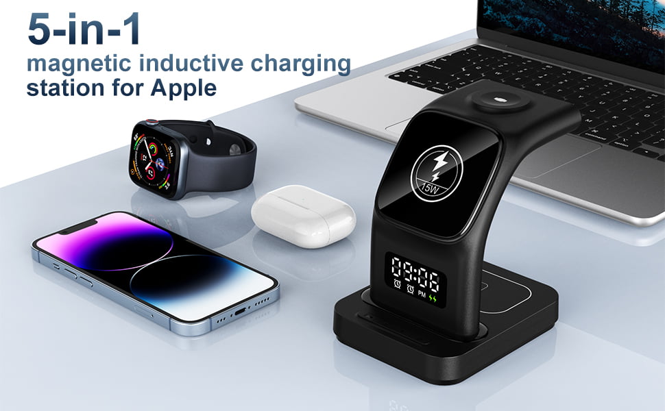 Statie de Incarcare Wireless 5 in 1 SONORH® – Incarcare Rapida 15W, MagSafe, pentru iPhone, Smart Watch si AirPods/Pro, Samsung, Huawei, Ceas, Alarma si Lumina de Noapte